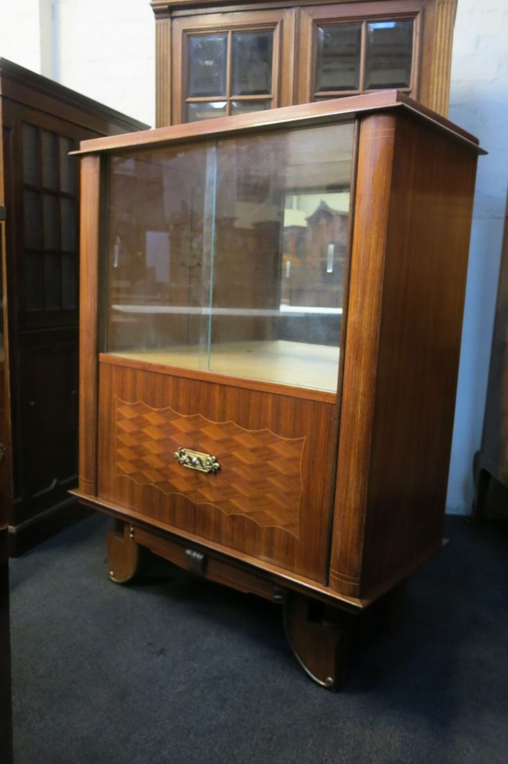 French Art Deco oak display cabinet with sliding glass doors and 2 bottom oak doors on pillar base c1940 $1250
