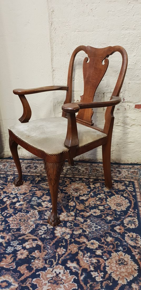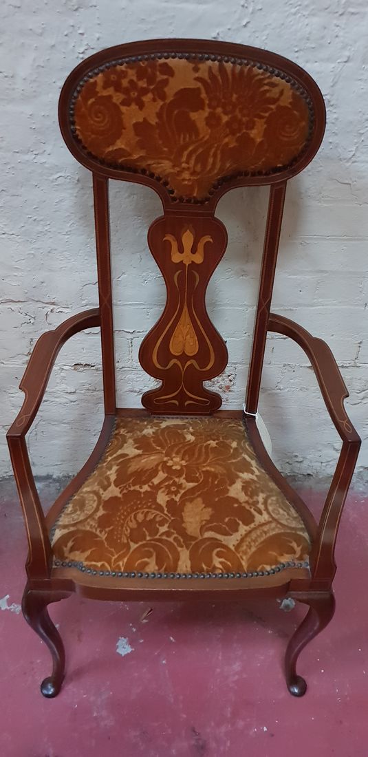 Fine quality sheraton revival-art nouveau inlayed carver chair. Made from mahogany with fruitwood inlays through out. Original upholstery. c1910 $795