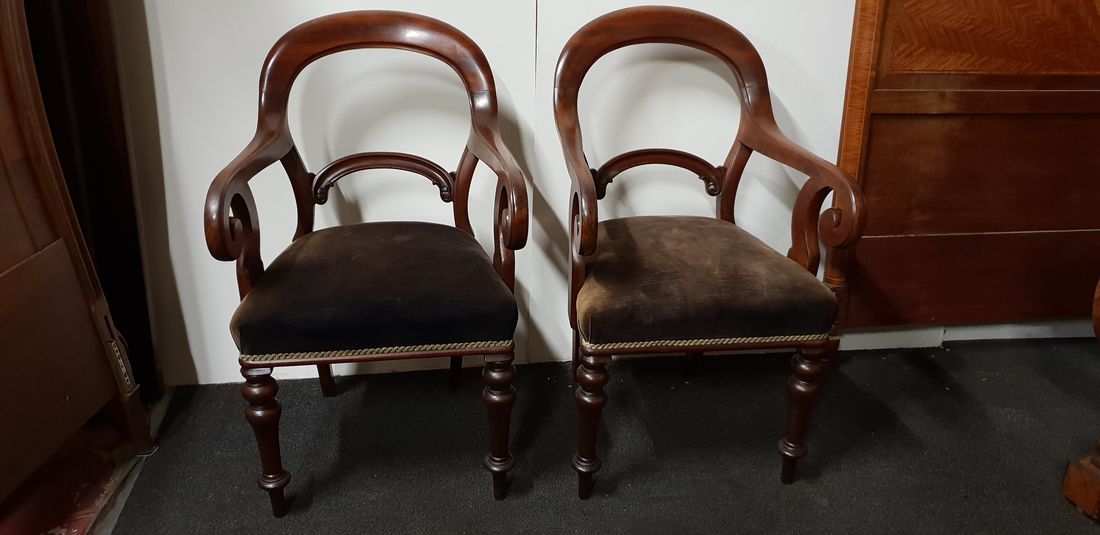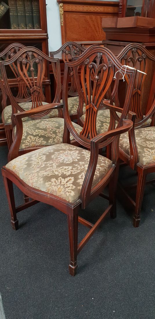 Set of 6 Hepplewhite dining chairs in mahogany timber, original upholstery which is easy to re-do in desired fabric, but original is still functional and useable. Lovely Hepplewhite design with slat back and floral carving. 4 standard chairs and 2 carvers ( arm chairs). $990 lot.