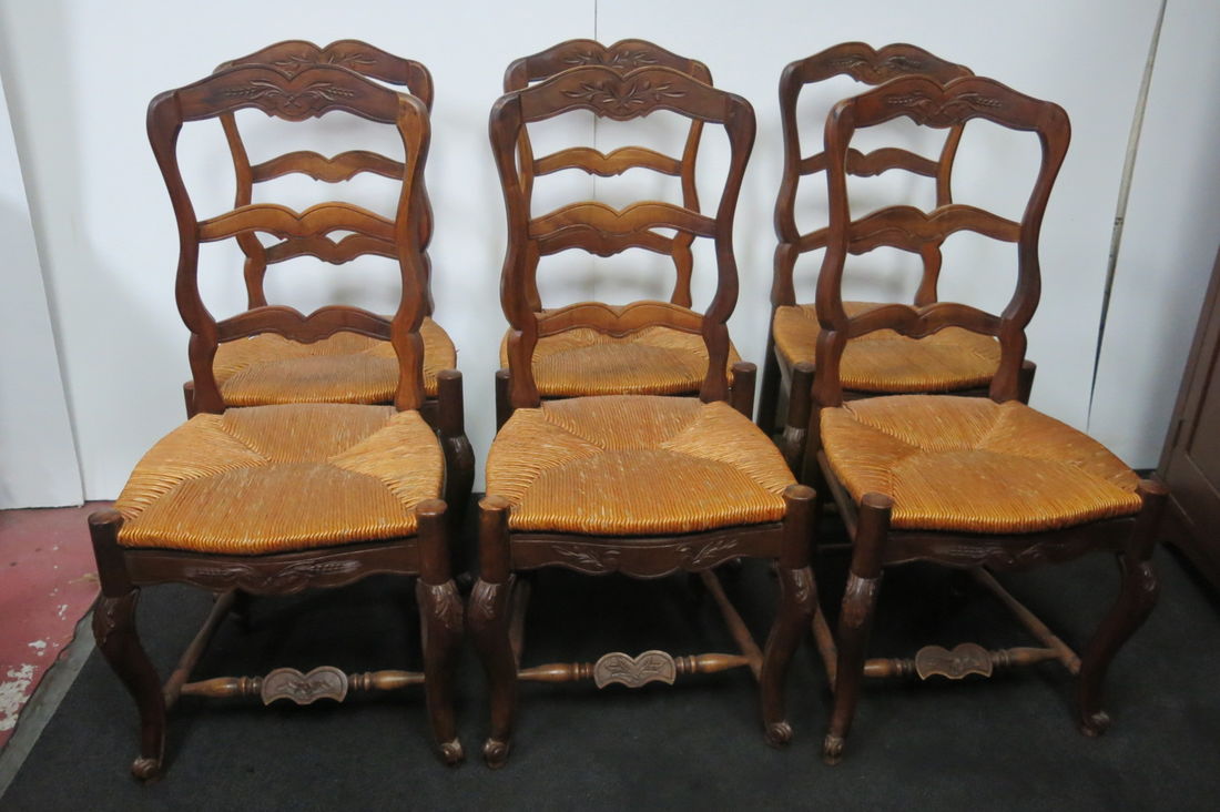 Set of 6 French walnut dining chairs with rush seats in excellent condition. Carved barley-wheat emblems on back, seat and rails. C1930s $225 each